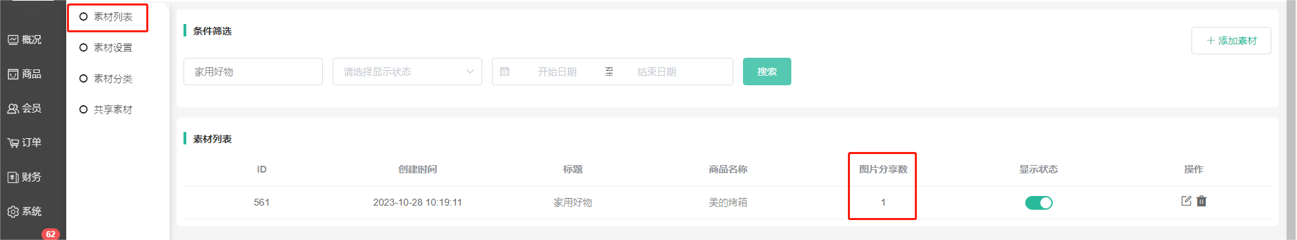 素材列表添加素材:设置好素材标题,关联的商品只能选择一件(支持平台所有商品),素材文案,上传好商品图片(图片最多只能上传9张),选择是否显示(选择显示则保存后在前端就可以查看到)