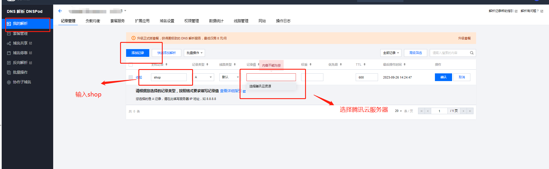 1、登录 DNSPod 管理控制台 快速添加解析。如下图所示: